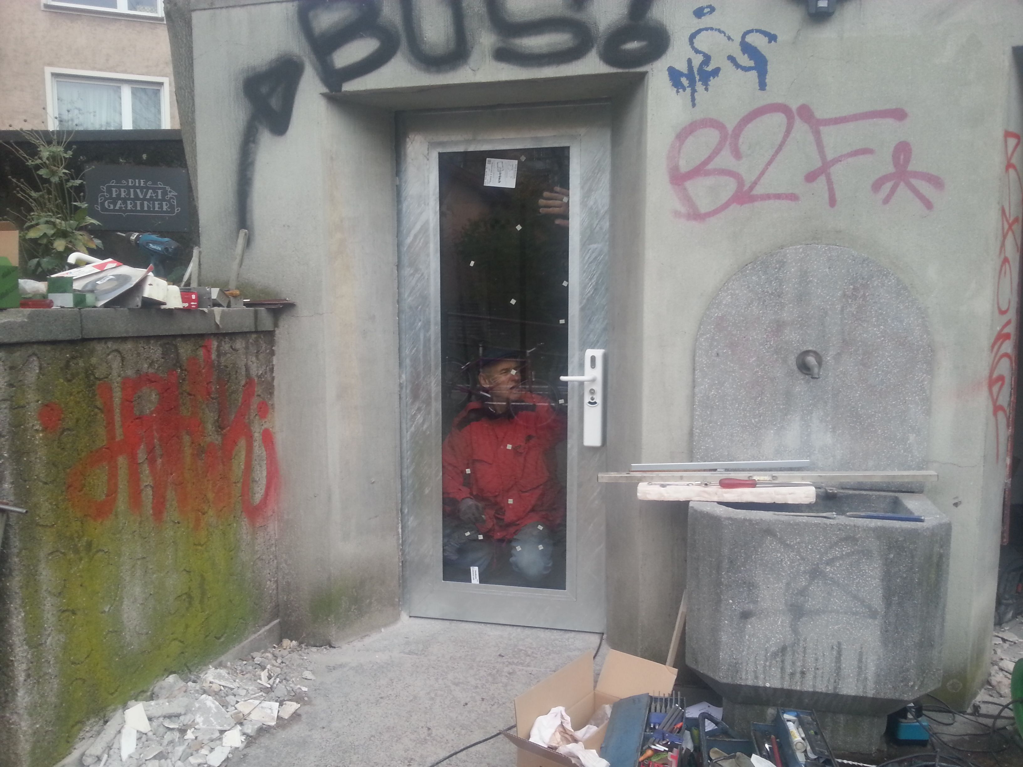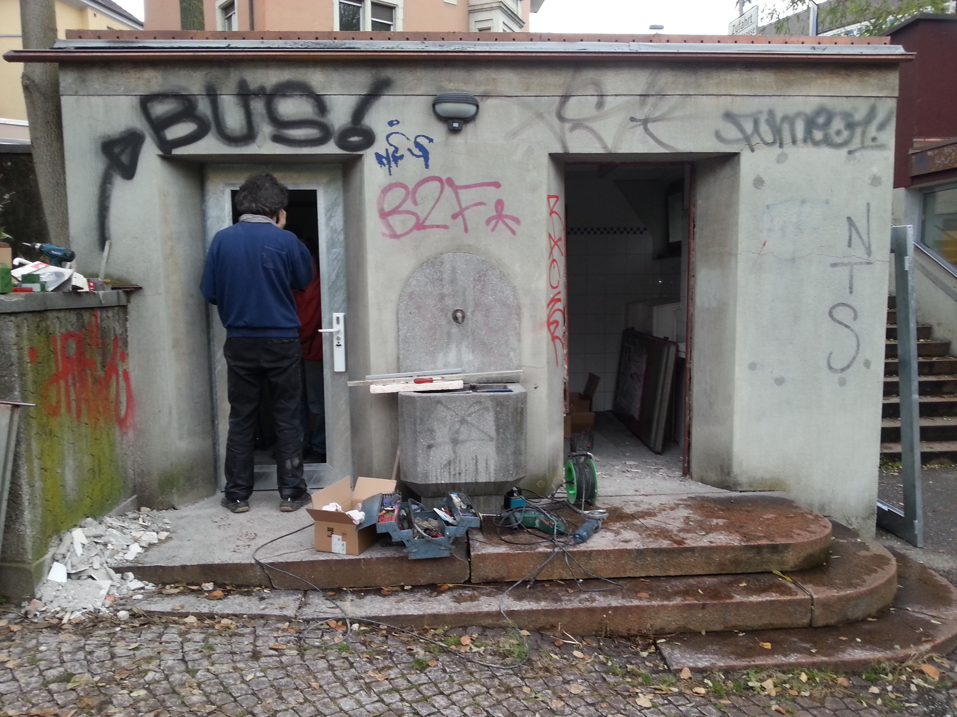 Seit heute werden die neuen Türen im Bahnhof WC montiert. Die alten, verrotten Rosthaufen sind entfernt. Ein grosses Glasfenster bringt Helligkeit ins Innere. Von aussen wird der Blick ins Innere geöffnet. Wir erhoffen uns damit ein einladenderes WC. Neue Münzschlösser stellen die Funktion sicher. Nach wie vor kann man für einen Fünfziger das WC benutzen.
