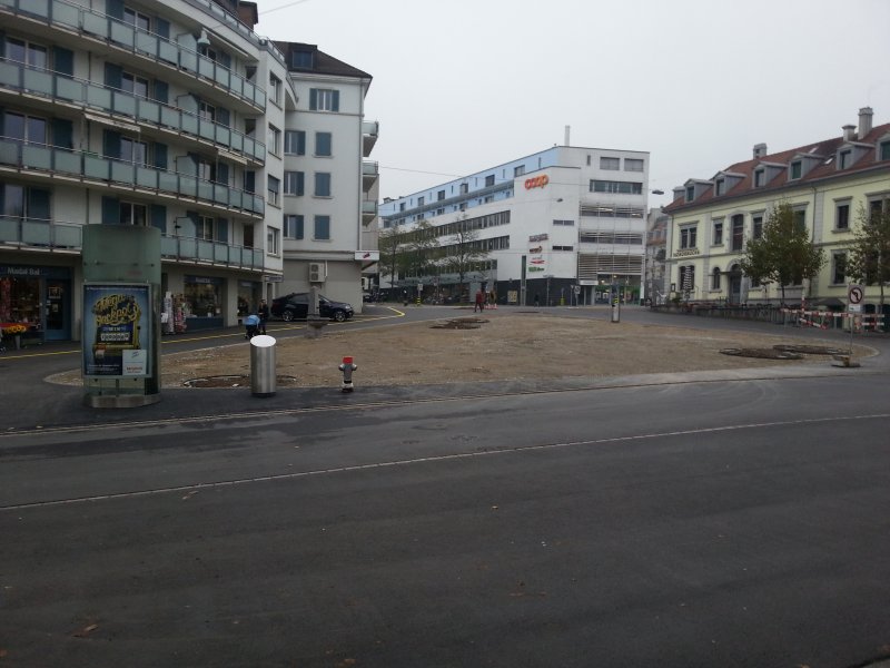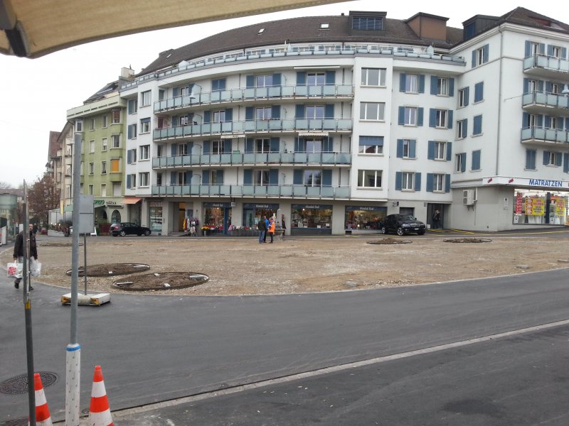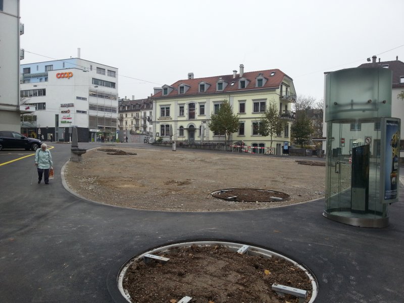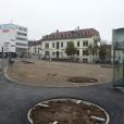 Der Belag in der Mitte des Platzes ist noch nicht definitiv. Der Netztaler Mergel in der Platzmitte wird erst im Frühling eingebracht. Er benötigt zum Trocknen rund zwei Wochen sonniges und wärmeres Wetter. Auch die Rundbänke um die Bäume werden erst in der wärmeren Jahreszeit montiert.