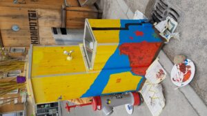 Da unser Dorfplatz auch während der Bauphase weiter genutzt wird, haben wir einen temporären Brunnen erstellt: Unseren “Bisongrasbrunnen”. Am 1. April 2021 haben wir ihn gebaut (Kein Scherz). Er wird als Wasserquelle für unsere beiden Frischwarenmärkte am Dienstag und Samstag von den Marktfahrern genutzt.
