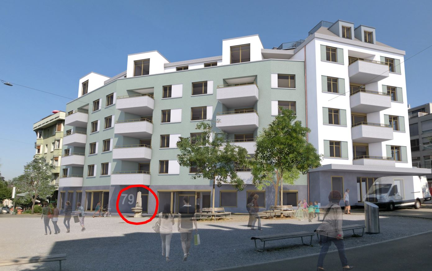 Der bestehende Brunnen (rot) bleibt. Er wird nur während der Bauphase hinter dem Bauzaun verschwinden. Nach Abschluss der Bauphase kann er am selben Ort wieder genutzt werden.