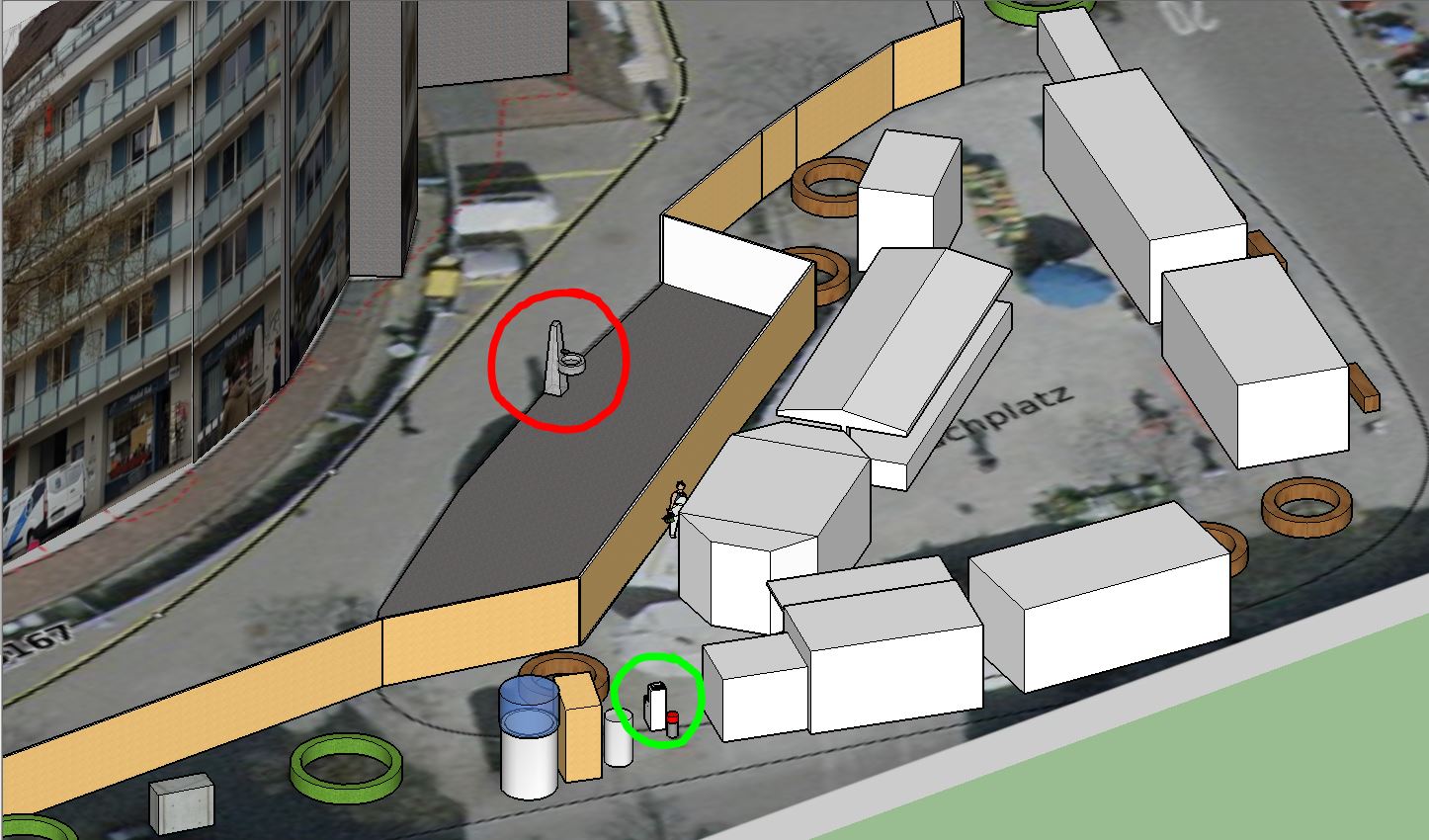 Plan bestehender Brunnen (rot) hinter Bauzaun – Ersatzbrunnen (grün):