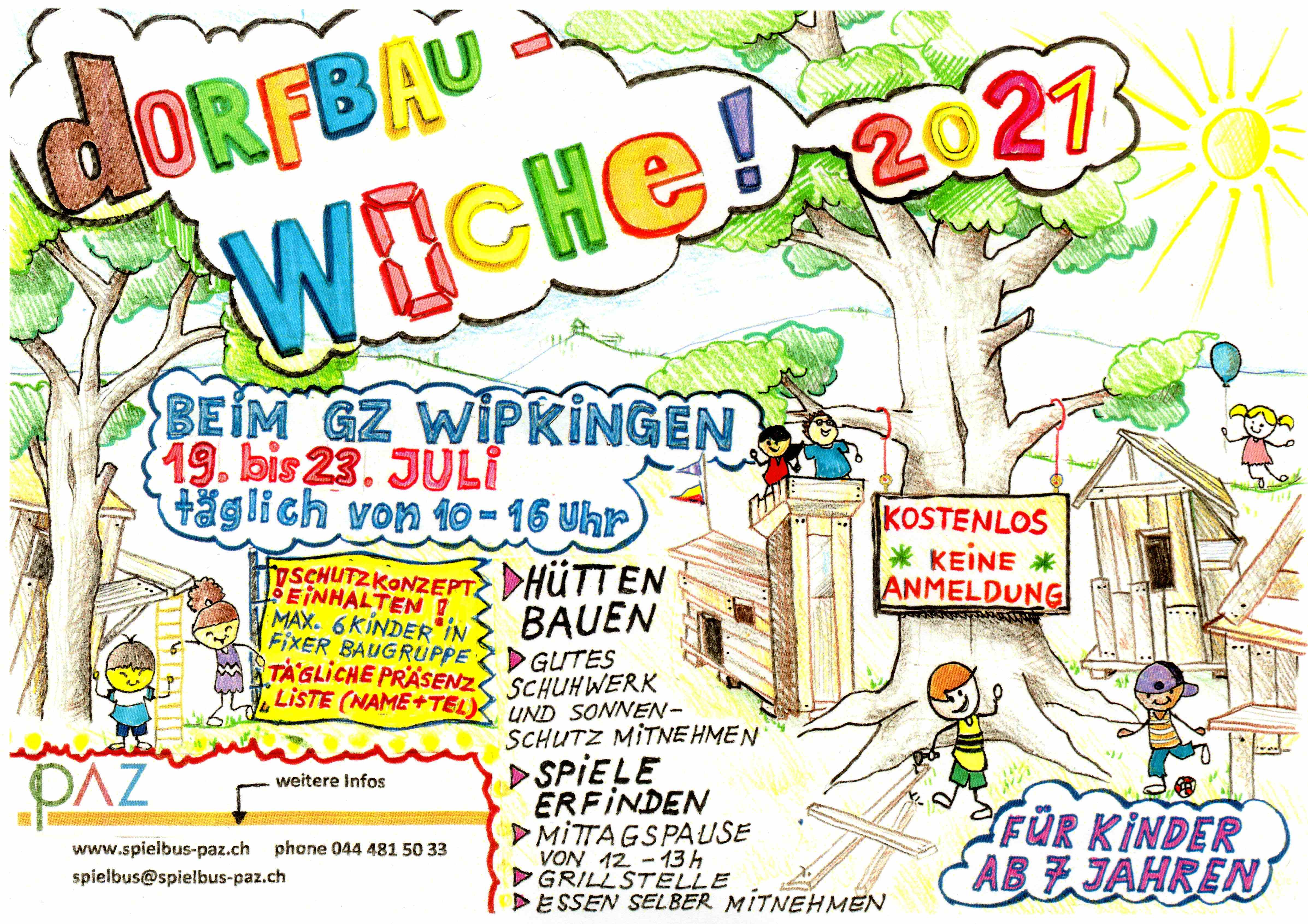 Wie bereits schon einmal führt der Spielbus auch dieses Jahr wieder eine Dorfbauwoche auf der Wiese beim GZ Wipkingen durch. Täglich von 10-16 Uhr werden Hütten gebaut. Das Projekt richtet sich in erster Linie an schulpflichtige Kinder der 1. – 6.Klasse. Willkommen sind auch jüngere Geschwister (in Begleitung) sowie Eltern oder Grosseltern, welche sich beteiligen möchten.
