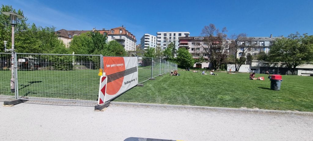 Während der Bauzeit steht auf dem einem Teil der Wiese neben dran ein Provisorium aus Containern. Damit dieses gebaut werden kann, ist die öffentlich zugängliche Wiese halbiert und durch einen Bauzaun abgetrennt. Das wird im sowieso schon sehr stark genutzten Wipkingerpark für noch mehr Enge sorgen.