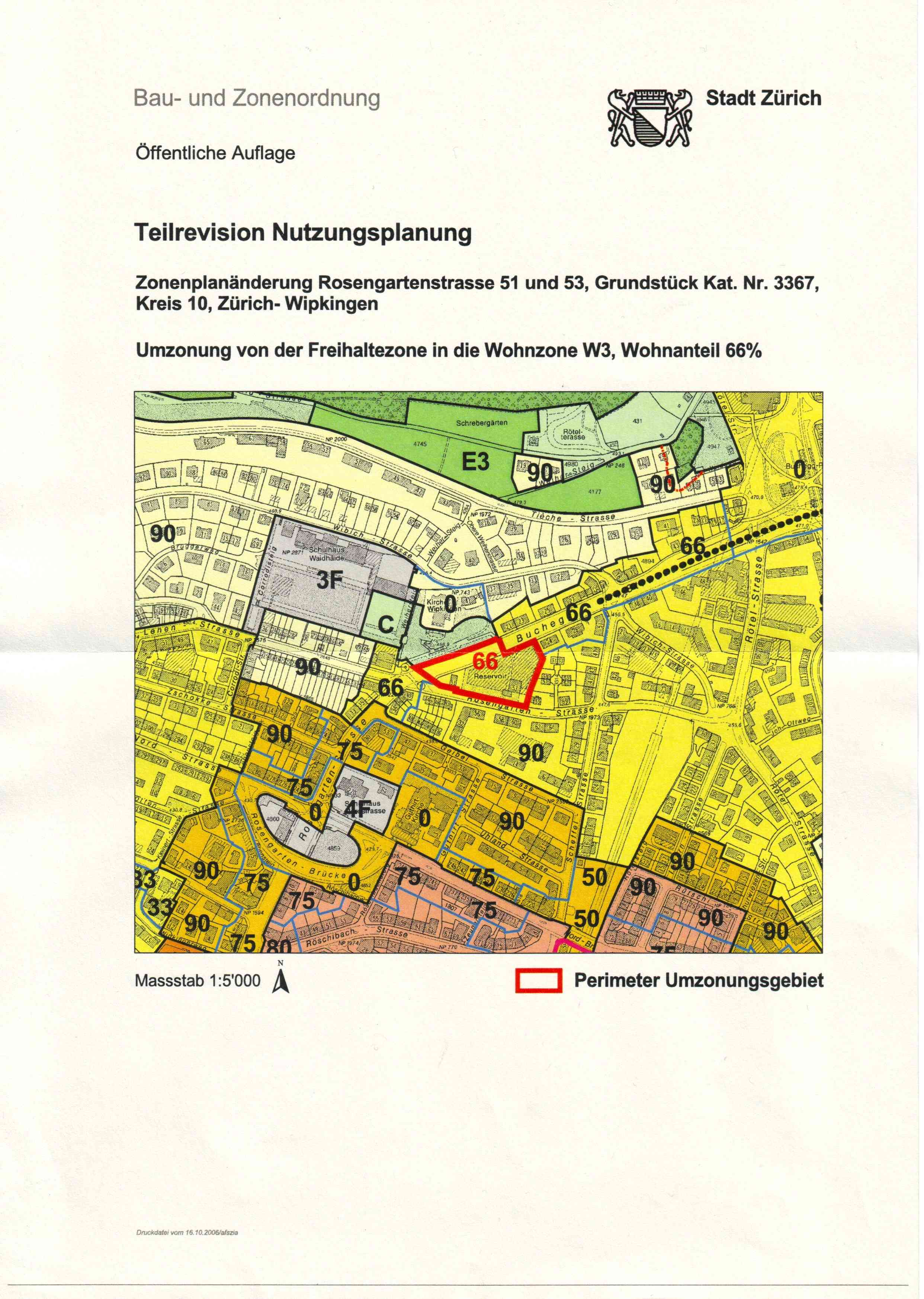 Das Gelände des ehemaligen Wasserreservoirs an der Rosengartenstrasse 51 und 53 wird von der Freihaltezone in eine Wohnzone W3 mit einem Wohnanteil von 66 % umgezont.