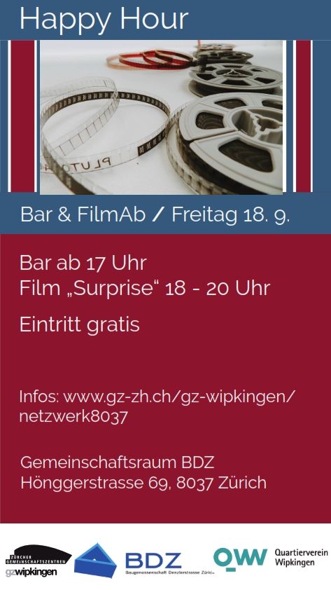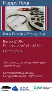 Am kommenden Freitag wird ein “Film Surprise” im GZ Wipkingen gezeigt. Der Eintritt ist frei, die Bar öffnet um 17 Uhr, der Film beginnt um 18 Uhr.