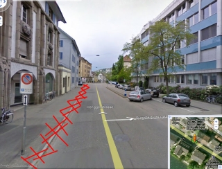Das Parkieren (Aufstellen zu anderen Zwecken als zum Güterumschlag oder Ein- und Aussteigenlassen) ist verboten: Auf dem limmatseitigen Fahrbahnrand zwischen den Häusern Nrn. 51 und 5.”