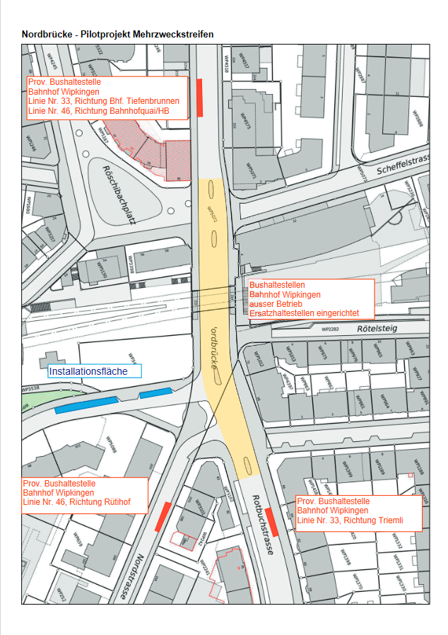 Um Erkenntnisse für die geplante Umgestaltung der Nordbrücke (ab 2025) zu gewinnen, erstellt die Stadt Zürich bei der Nordbrücke im Bereich Scheffel- bis Lägernstrasse einen temporären Mehrzweckstreifen. Dieser ermöglicht flächiges Queren für die zu Fuss gehenden ohne Umwege. Die Fussgängerstreifen werden aufgehoben und die Fussgängerschutzinseln neu erstellt.
