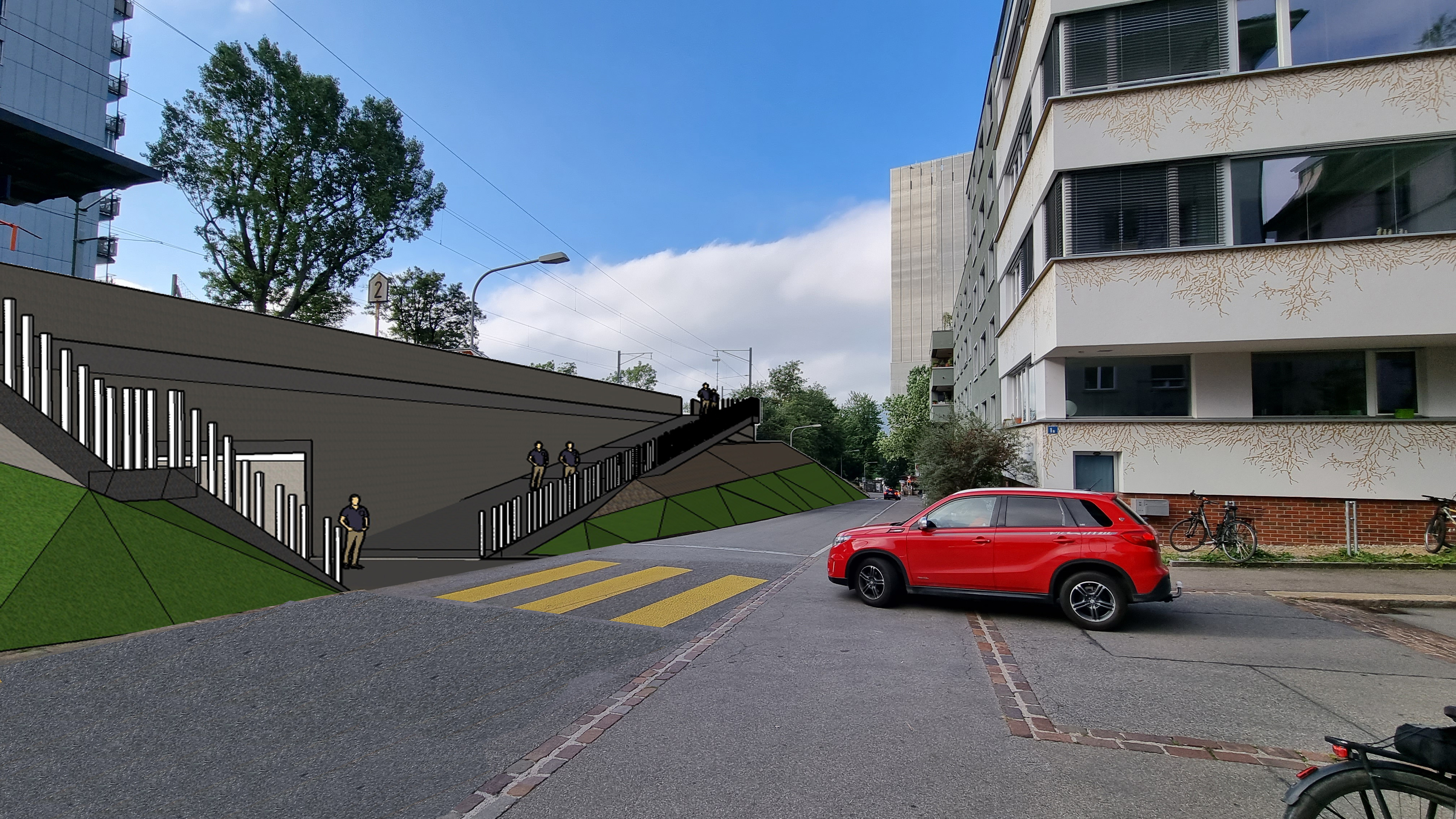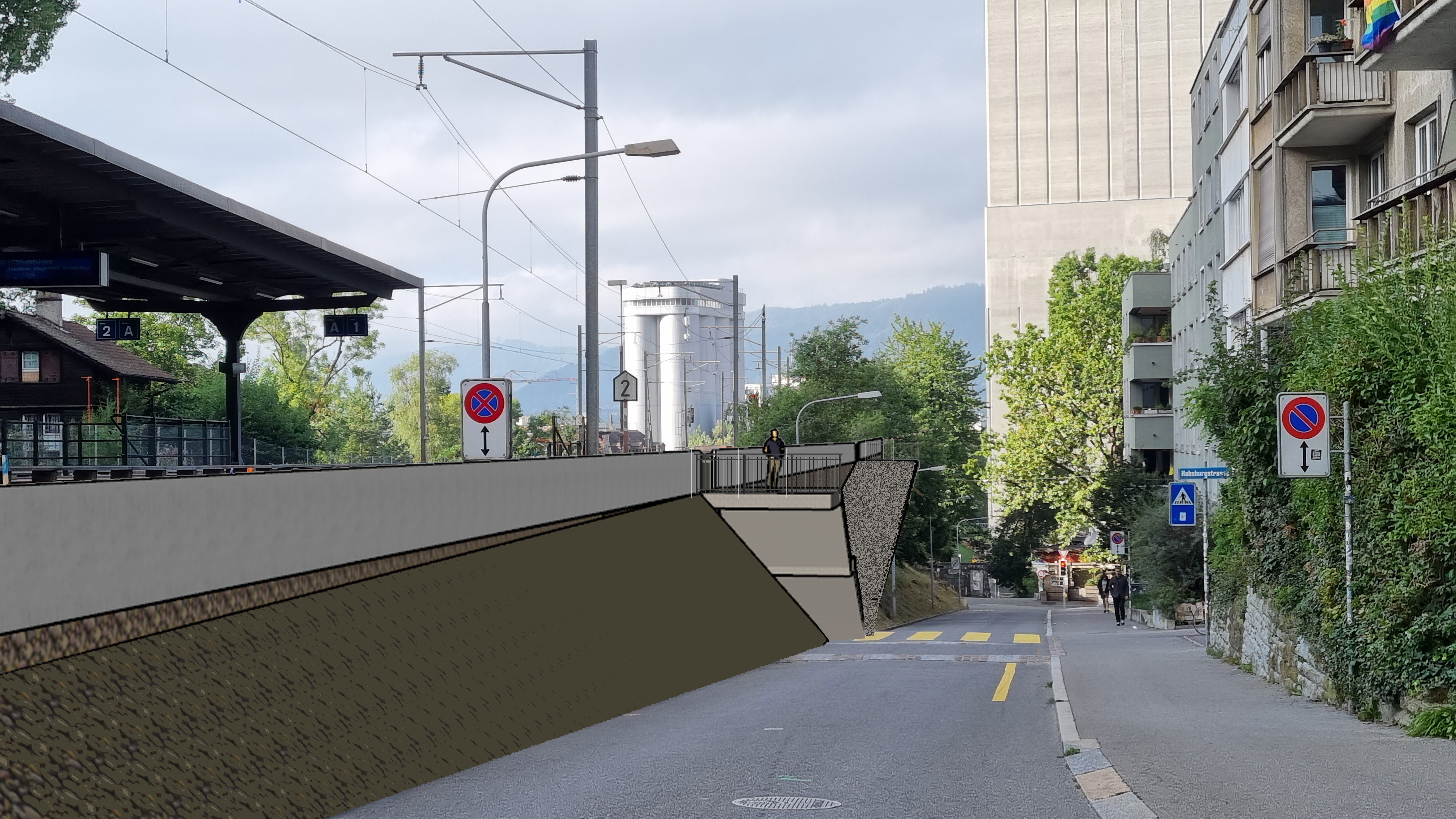 Die bisherige Unterführung an der Dammstrasse wird etwas weiter nach unten in Richtung Stadt verlegt. Neu wird sie die beiden Gleise untertunneln, so dass der Zugang auf das Perron in Richtung Hauptbahnhof weiterhin möglich ist. Neben der Unterführung entstehen auf beiden Seiten der Gleise je eine Treppe und eine Rampe. Durch die Unterführung wird eine neue direkte Quartierverbindung vom Lettenfussweg zur Damm- beziehungsweise Habsburgstrasse möglich. So positiv diese Neuerungen sind, so negativ fällt die beabsichtigte Ausführung ins Gewicht. Statt begrünter, hitze- und lärmmindernder Bahnborde sind mächtige Betonwände geplant. Hier besteht unserer Meinung eindeutig ein grosser Verbesserungsbedarf.