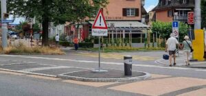 In der Gegenrichtung warnt seit kurzem ein offizielles Strassenschild die Autofahrer vor Fussgängern. Der kleine graue Minipfosten hat keinerlei Funktion und wird von den Autofahrenden leicht übersehen. Kein Wunder, denn er ist nicht Signalgelb markiert, wie ein offizieller Warnpfosten vor einem offiziellen Fussgängerstreifen.