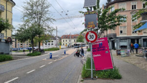 Etwas hilflos kippt das Weltformatplakat in die Strasse hinein und wirbt, leider schlecht lesbar, für Rücksicht. Es ist kein offizielles Strassenschild. Ausserdem verdeckt es die Sicht auf wartende Fussgänger.