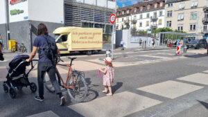 Der Randstreifen wird gerne von Transportfahrzeugen als Parkplatz genutzt, um die anliegenden Geschäfte zu beliefern. Allerdings versperren sie die Querung für Fussgänger. Wir behaupten: Auf einem Fussgängerstreifen würde der Fahrer niemals parkieren!