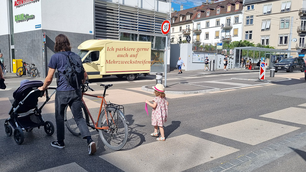 Der Randstreifen wird gerne von Transportfahrzeugen als Parkplatz genutzt, um die anliegenden Geschäfte zu beliefern. Allerdings versperren sie die Querung für Fussgänger. Wir behaupten: Auf einem Fussgängerstreifen würde der Fahrer niemals parkieren!