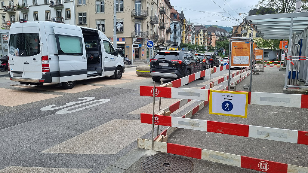 Auch der Mittelstreifen ist praktisch und wird vom “Trouble Shooter der VBZ” als Abstellplatz missbraucht, weil er wohl wegen der Baustelle nirgends eine andere Parkfläche findet.