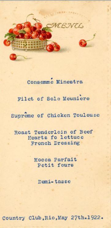 Menukarte vom «Country Club» in Rio vom 27. Mai 1922