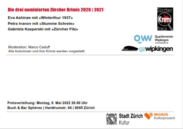 Zürcher Krimipreis 2020/2021: Preisverleihung am 9. Mai